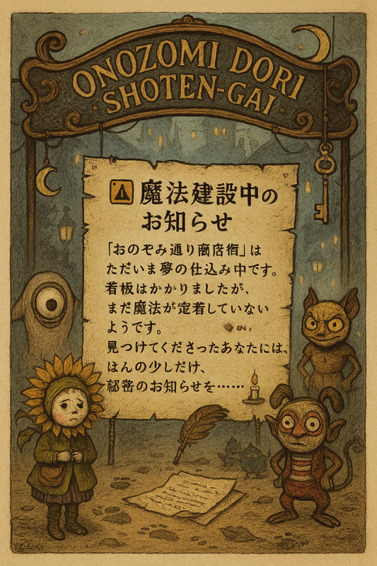 それが「おのぞみ通り」を中心に広がりつつある夢の商店街です。まだ頭の中のアイデアだけですが、魔法の力を借りて、ただいま突貫工事中です!