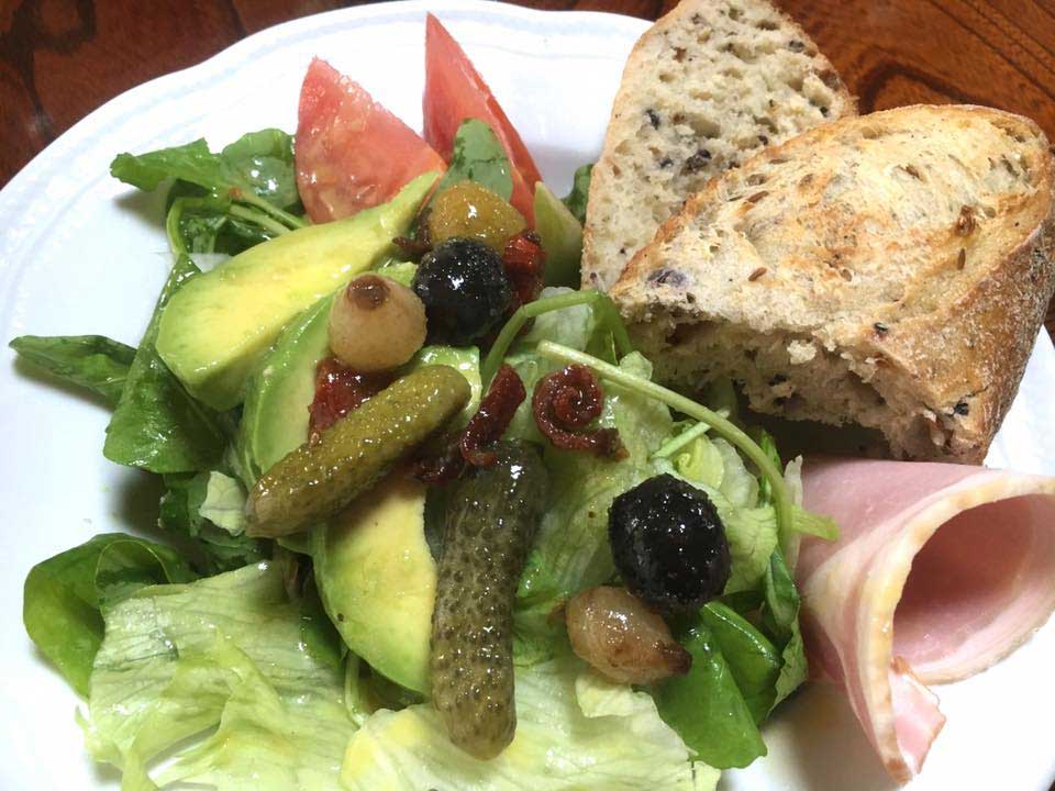 食べ終わって、お皿にドレッシングが残らないように濃いめの味で、サラダボールのなかでささっと手でドレッシングと混ぜ合わせて、お皿に盛ります。